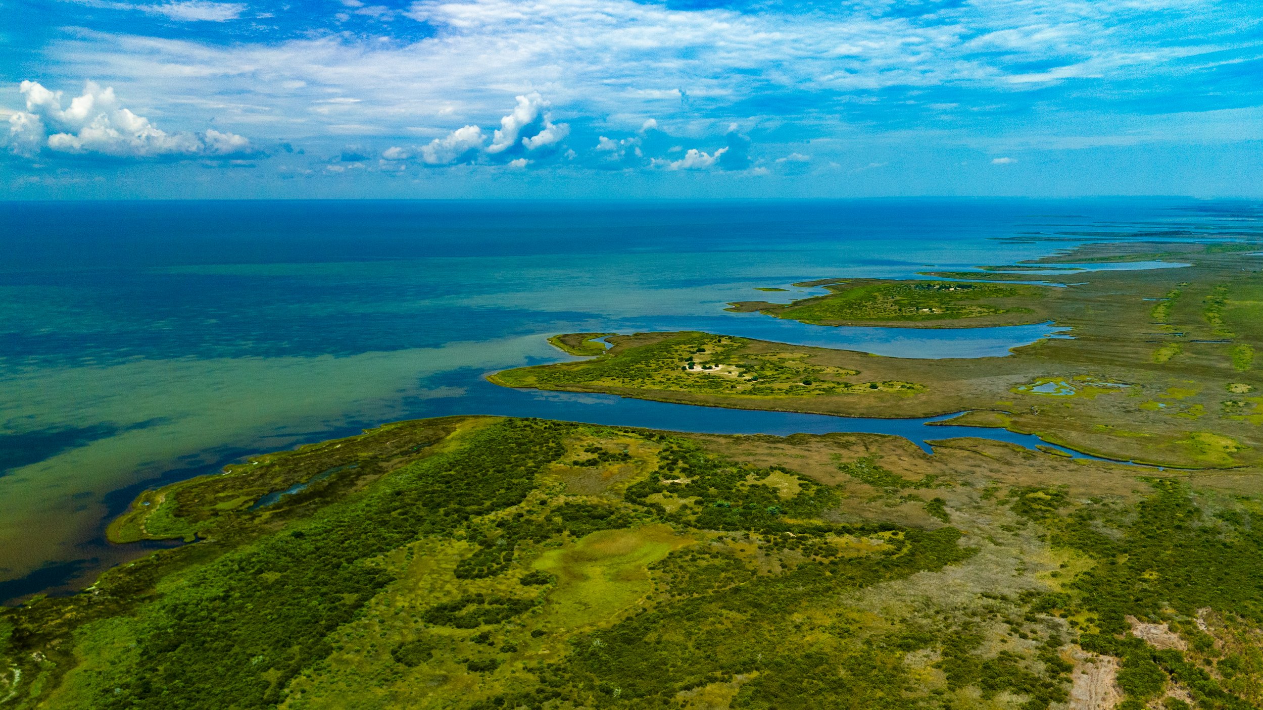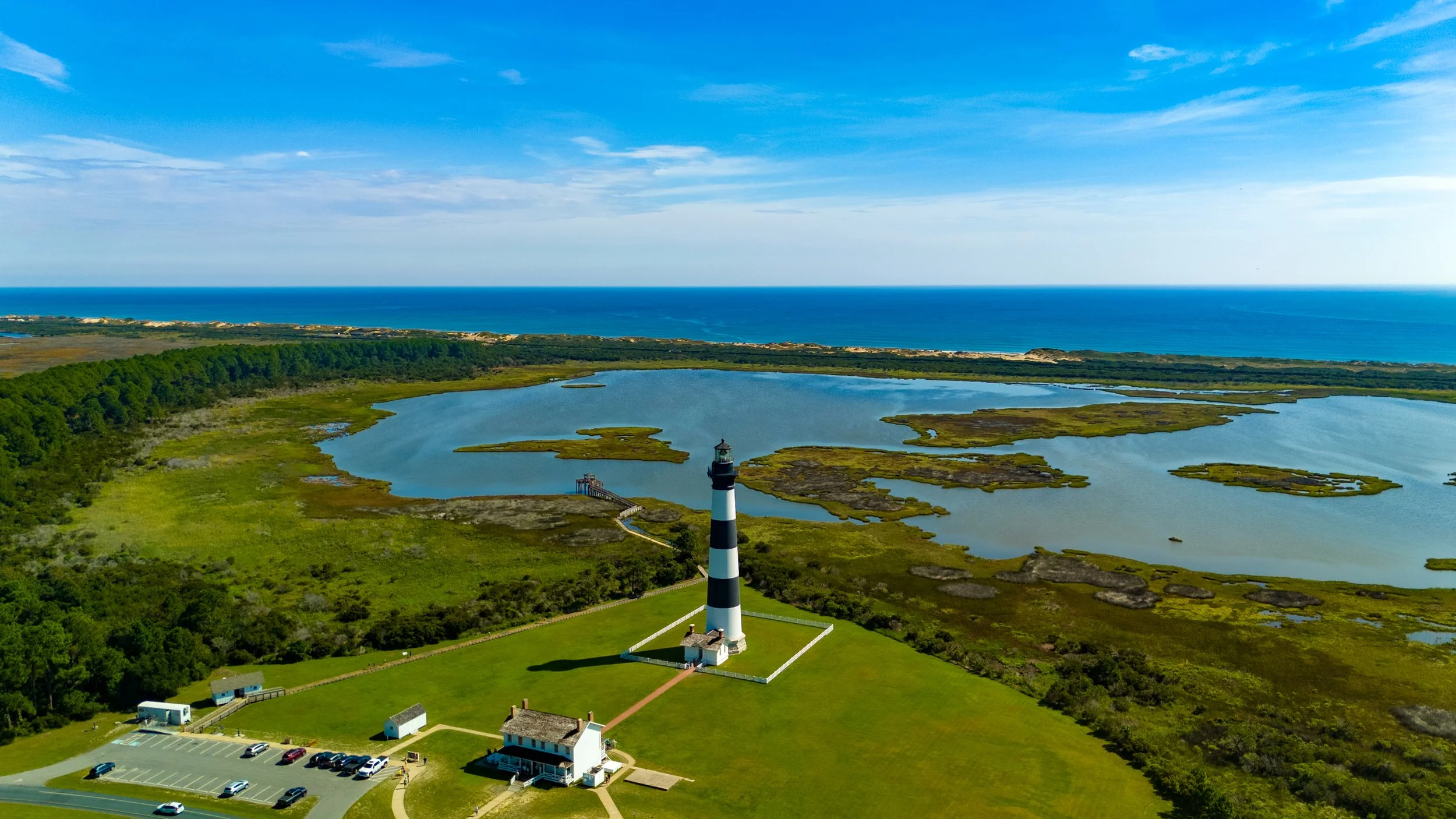 Rising above sweeping marshland and the distant Atlantic horizon, the striped lighthouse stands in quiet command over the Outer Banks. From above, the barrier island reveals its layered landscape — sound, dune, and sea held in delicate balance.